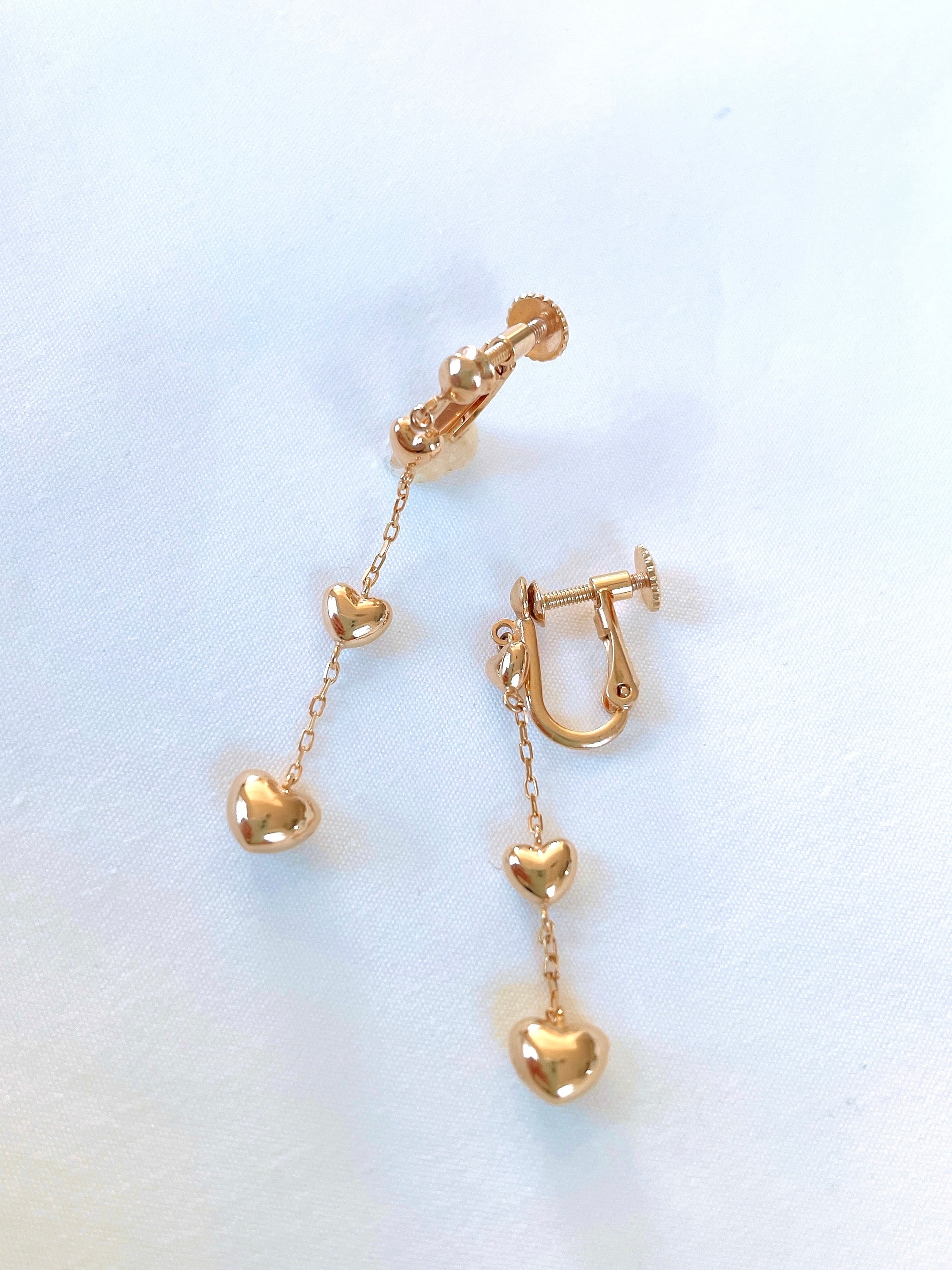 3つの大中小のハートが揺れるイヤリングです。
