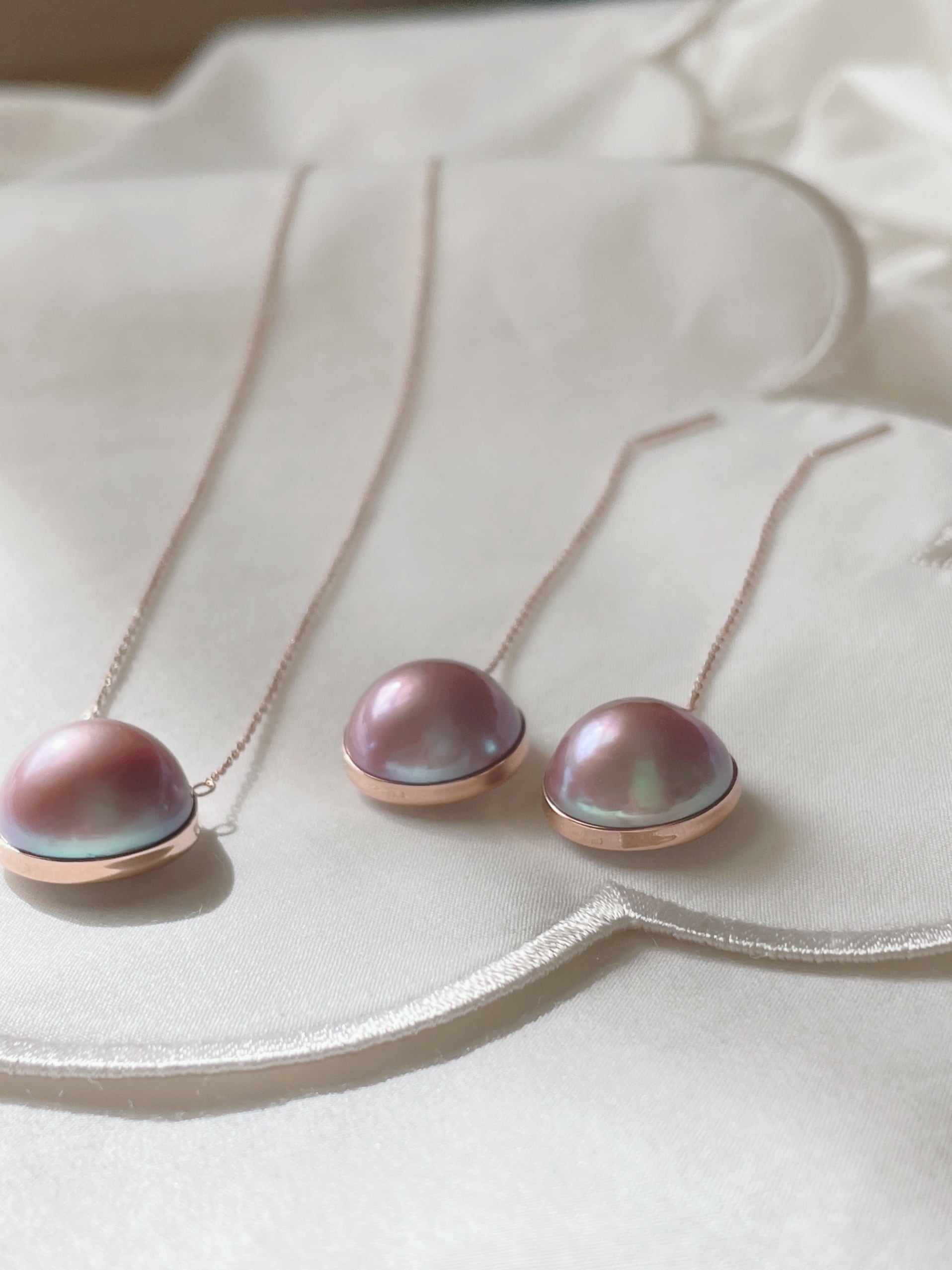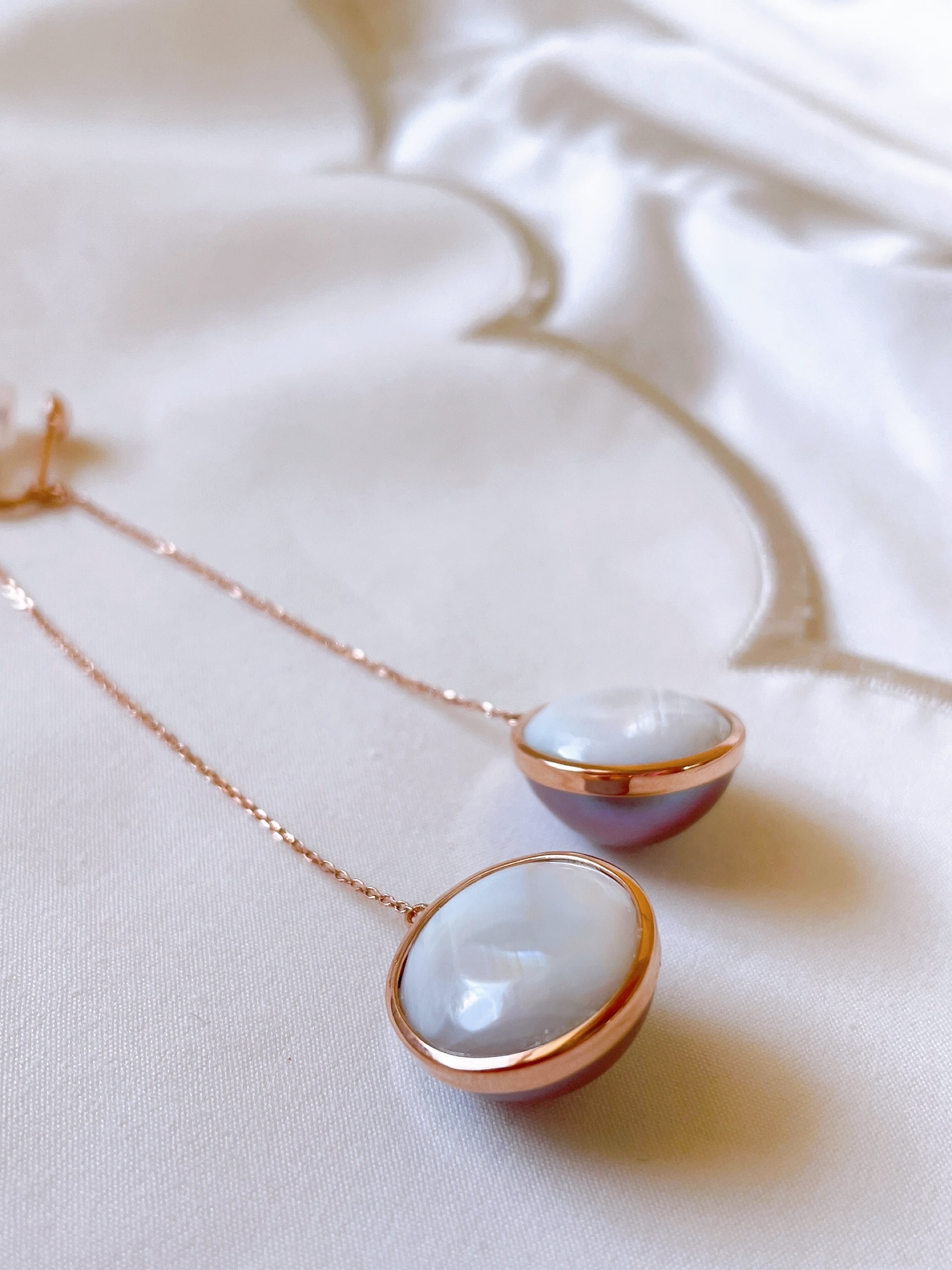 揺れるハーフパールピアス・イヤリングは、裏面に合わたホワイトの貝の表情も楽しめるデザインです。