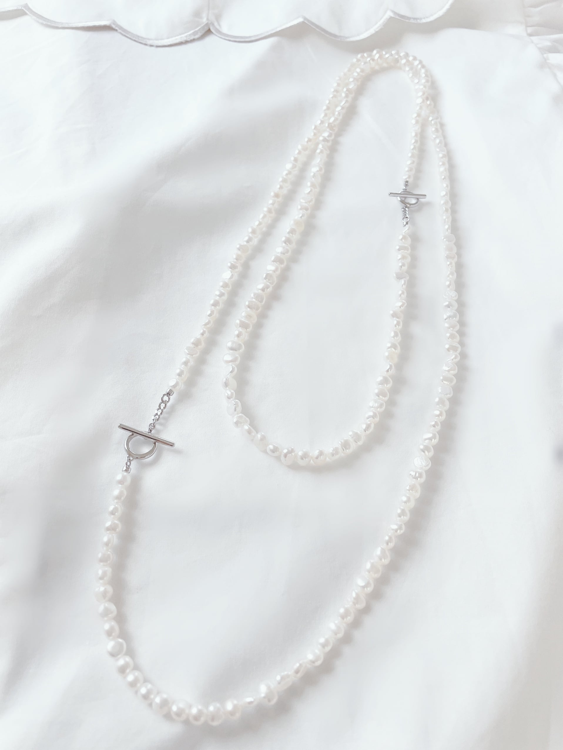 トグル部分を外すと約38cmのショートネックレスと約82cmのロングネックレスの単品使用が出来ます。又は2連で使用が可能です。